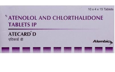 Atecard D Tablet is a combination of two blood-pressure lowering medicines: Atenolol and Chlorthalidone. Atenolol is a beta blocker which works specifically on the heart to reduce heart rate and make the heart more efficient at pumping blood throughout the body. Chlorthalidone is a diuretic which lowers blood pressure by removing extra water and certain electrolytes from the body. Over time it also relaxes blood vessels and improves blood flow.