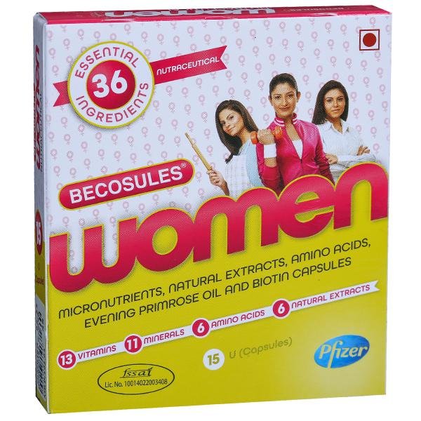 Becosule Woman Capsules are indicated for use in the treatment of deficiency of vitamin B and other essential vitamins. It is ideal for tissue repairing, curing sore tongue and mouth ulcers, and preventing premature hair greying.