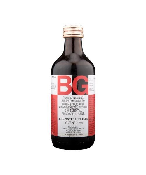 B.G. Prot L Syrup contains Biotin, Cyanocobalamin, Zinc, Folic acid, Inositol, L-lysine and Pyridoxine.