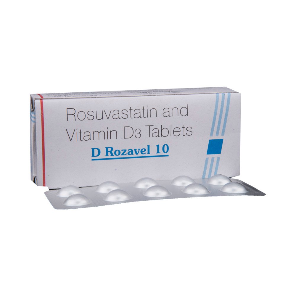 D Rozavel 10 Tablet is used to treat high cholesterol. It is a combination of two medicines that reduces “bad” cholesterol (LDL) and triglycerides (fats) levels in the body. It may also reduce risk of future heart attack and stroke. Lifestyle changes like low-fat diet, exercise, and not smoking may help this medicine to work better. It may cause diarrhea as a side effect, so it is better to have this medicine with food. It may change liver function and blood sugar levels so monitor them properly. This medicine may also cause reduction in calcium levels, so have regular blood tests to monitor the level of calcium. Dizziness, stomach pain, muscle pain, and constipation are some other side effects associated with this medicine.