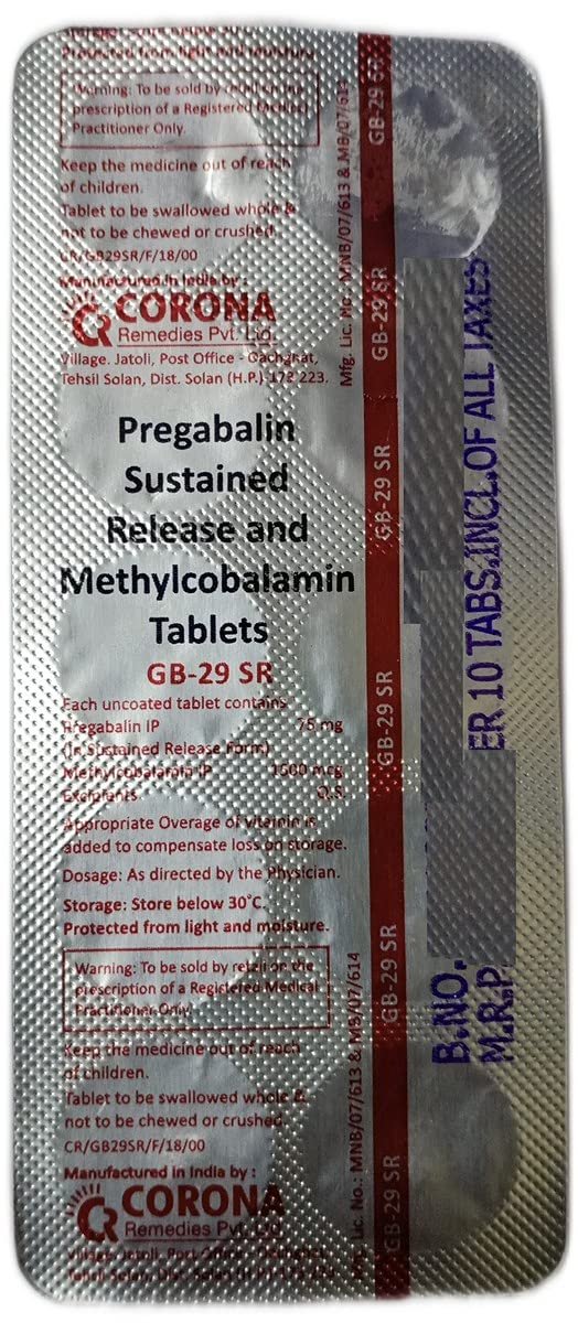 GB 29 1500mcg/75mg Tablet SR is taken by mouth with or without food, preferably at bedtime. It is advised to take it at the same time each day as this helps to maintain a consistent level of medicine in the body. Take this medicine in the dose and duration advised by your doctor as this is a habit-forming medicine. If you miss a dose of this medicine, take it as soon as you remember. Finish the full course of treatment even if you feel better. It is important that this medication is not stopped suddenly without talking to the doctor.