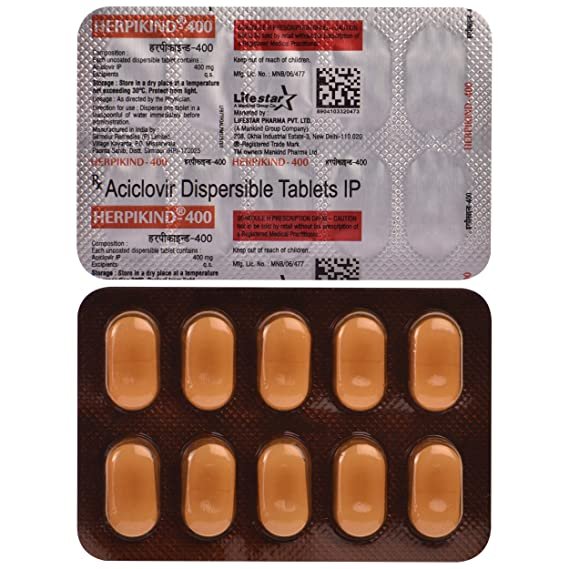 Herpikind 400 Tablet DT should be taken in the dose and duration as advised by your doctor. Do not skip any doses and finish the full course of treatment even if you feel better. Dissolve it in a glass of water before taking it. It may be taken with or without food, but it is better to take it at a fixed time. If you miss a dose, take it as soon as possible. However, if it is almost time for your next dose, skip the missed dose and go back to your regular schedule. Do not double the dose. You should drink plenty of water while on treatment with this medicine as it helps to prevent dehydration and kidney damage.