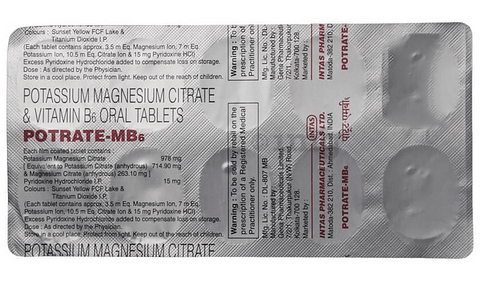 Potrate MB6 Tablet contains Potassium Magnesium Citrate (978mg) and Pyridoxine Hydrochloride (15mg) as active ingredients.