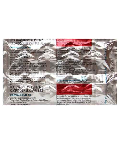 Preva Gold 10 Capsule is a combination of three medicines: Aspirin, Rosuvastatin and Clopidogrel, which prevents heart attack. Aspirin and clopidogrel are antiplatelet medications. They work by preventing the platelets from sticking together and decrease the formation of harmful blood clots. Rosuvastatin is a lipid lowering medication that blocks the body’s ability to produce “bad” cholesterol (LDL) and improves the level of “good” cholesterol (HDL).
