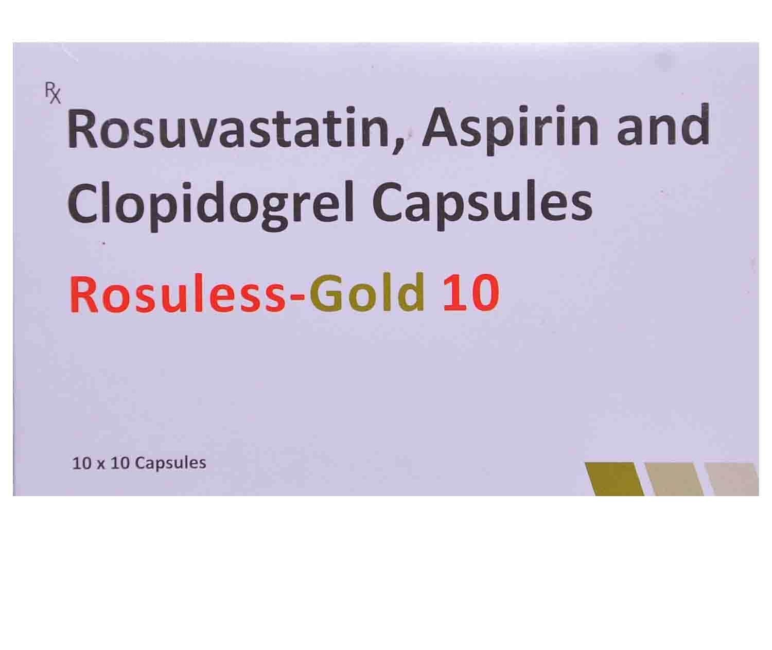 Rosuless-Gold Capsule is used for prevention of heart attack. It is a combination of medicines that prevent clot formation in the blood vessels. It also helps to reduce increased cholesterol and triglycerides levels.