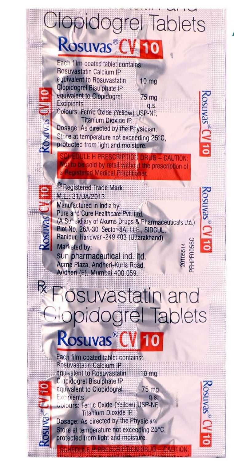 Rosuvas CV 10 Tablet should be taken with or without food. You should take it regularly at evenly spaced intervals as per the schedule prescribed by your doctor. Taking it at the same time every day will help you remember to take it. The dose and duration of treatment will depend on what you are being treated for. Do not stop taking it until you have finished the complete course, even when you feel better. Lifestyle changes like low-fat diet, exercise and not smoking may help this medicine to work better.