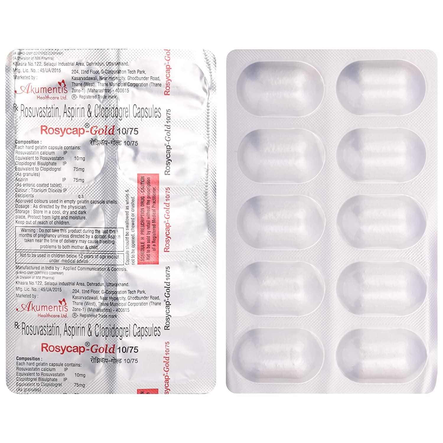 Rosycap-Gold 10/75 Capsule is used for prevention of heart attack. It is a combination of medicines that prevents clot formation in the blood vessels. It also helps to reduce increased cholesterol and triglycerides levels. This medicine should be taken with food regularly at a fixed time each day. This medicine should not be stopped abruptly and taken strictly as advised by the doctor. Lifestyle changes like low-fat diet, exercise, and not smoking may help this medicine work better. This medicine increases your risk of bleeding, so it is important to be careful while shaving, cutting nails, and using sharp objects. Few common side effects of this medicine may include stomach pain, indigestion, diarrhea, and muscle pain.