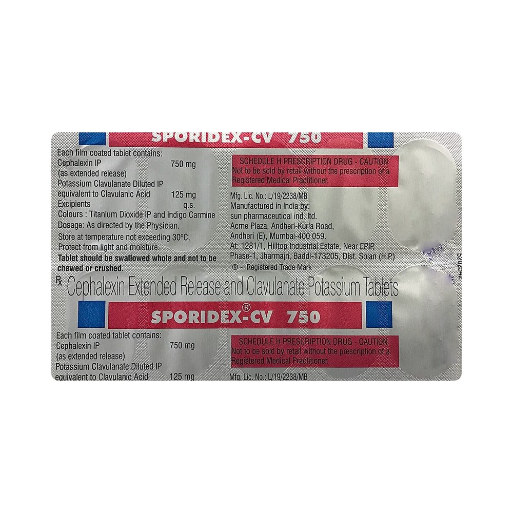 Sporidex-CV 750 Tablet ER may be taken with or without food. You should take it regularly at evenly spaced intervals as per the schedule prescribed by your doctor. Taking it at the same time every day will help you to remember to take it. The dose will depend on what you are being treated for, but you should always complete a full course of this antibiotic as prescribed by your doctor.