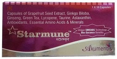 Starmune Capsule is a Multivitamin composition contains Astaxanthin, Benfotiamine, Biotin, Elemental chromium, Elemental magnesium, Elemental selenium, Elemental zinc, Flaxseed oil, Gingko biloba, Ginseng, Grape seed extract, L-isoleucine, L-leucine, L-valine, Lycopene, and Taurine.