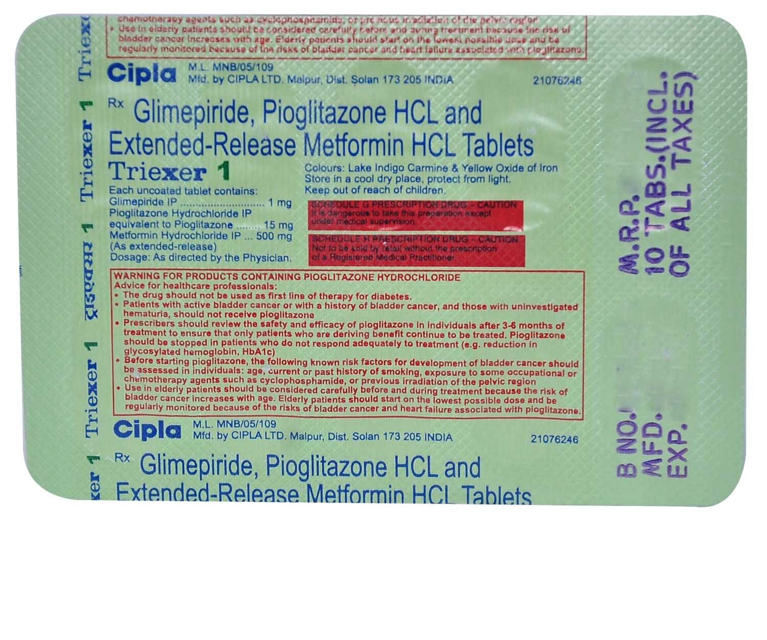 Triexer 1 Tablet ER should be taken in the dose and duration as advised by your doctor. It must be taken with food to avoid stomach upset. If you miss a dose, take it as soon as possible. However, if it is almost time for your next dose, skip the missed dose and go back to your regular schedule. Do not double the dose. Overdose may lead to low blood sugar (hypoglycemia).