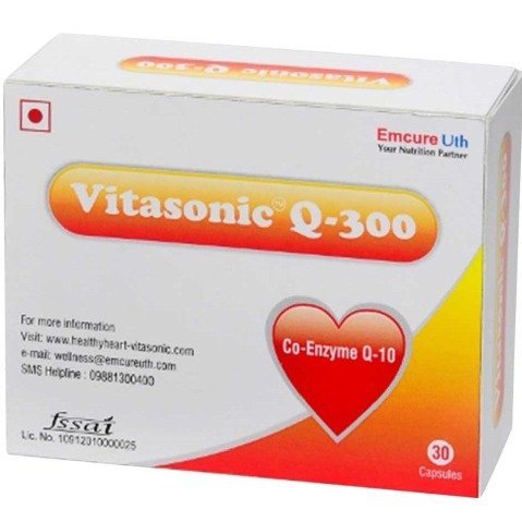 Vitasonic Q-300 Capsule is a soft gelatin capsules that contains Coenzyme Q10 as the active ingredient. It is a heart energizer and increases functional capacity of the heart. Useful in cases of heart failure, dilated cardiomyopathy, and statin induced myopathy.